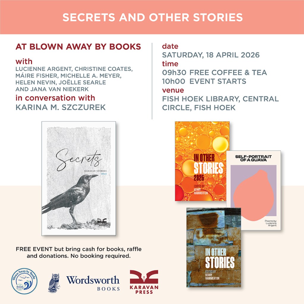 Please join us for another Blown Away by Books event at the Fish Hoek Library on 18 April 2026, at 9.30AM – this year celebrating Secrets, the latest Karavan Stories anthology (2025) and the stories that have flown into and from the project. Secrets contributors Lucienne Argent, Christine Coates, Máire Fisher, Michelle A. Meyer, Helen Nevin, Joëlle Searle and Jana van Niekerk will be in conversation with Karina M. Szczurek about the anthology and their other writings. Now in its fourth year, the Karavan Stories project has gathered a wonderful community of writers who have continued writing and collaborating together. Come and be inspired by their remarkable stories, those already written and those in the making!
