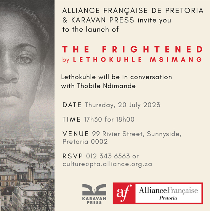 The Frightened by Lethokuhle Msimang is partly set in Paris. Lethokuhle herself lived and studied in Paris and has continued learning French at the Alliance Française de Pretoria. The institute has invited her to launch her novella with them. If you are in Pretoria on 20 July, this is your opportunity to meet Lethokuhle and to celebrate the launch of her stunning book with her. She will be in conversation with Thobile Ndimande.