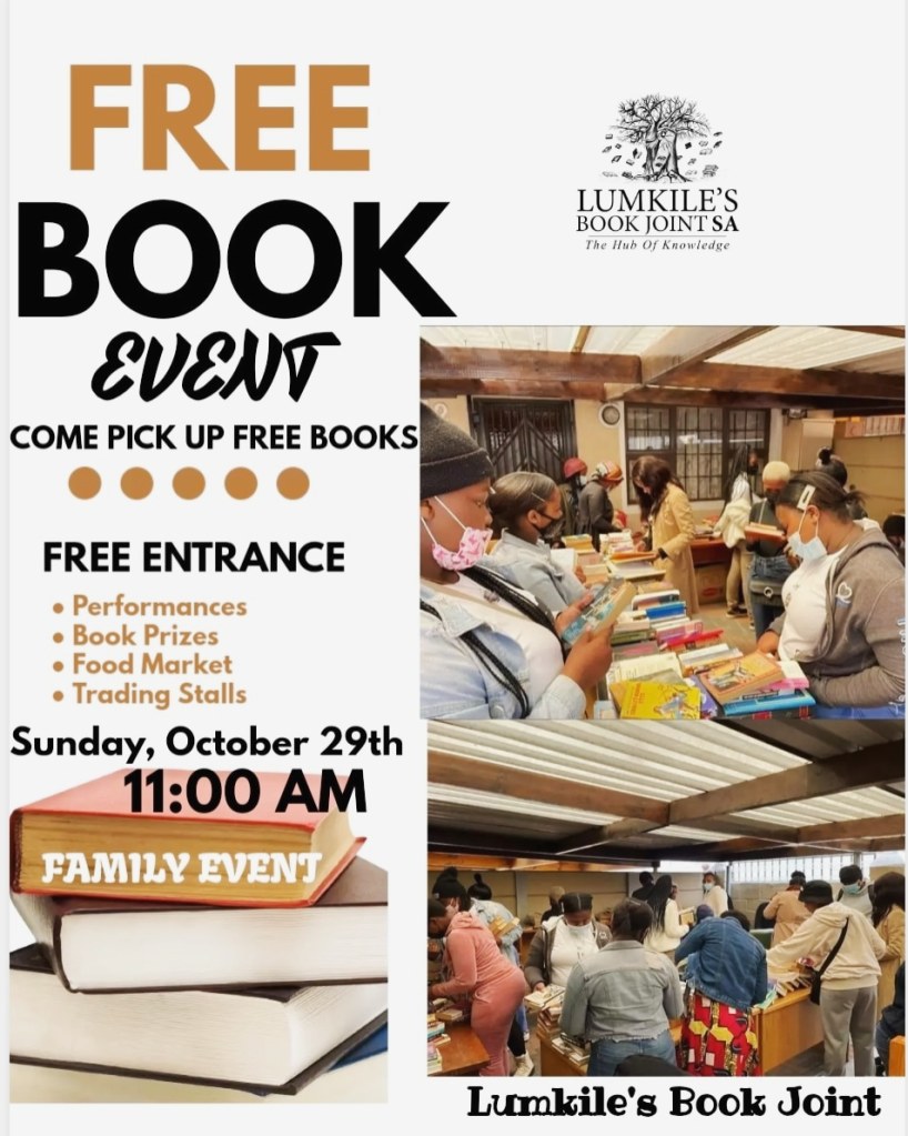 A wonderful event is coming up! The FREE BOOK event is taking place on Sunday, 29 October 2023, at Lumkile’s Book Joint.