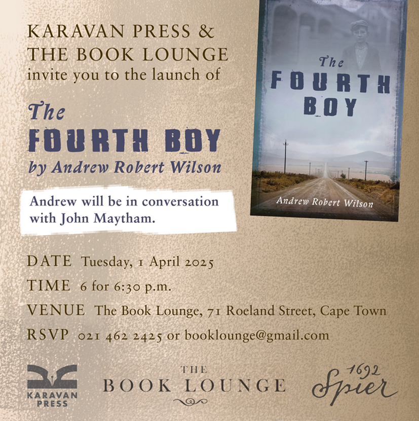 Please join us for the Cape Town launch of Andrew Robert Wilson’s The Fourth Boy at The Book Lounge on Tuesday, 1 April 2025, 6 for 6:30PM. Andrew will be in conversation with John Maytham. Not to be missed!
