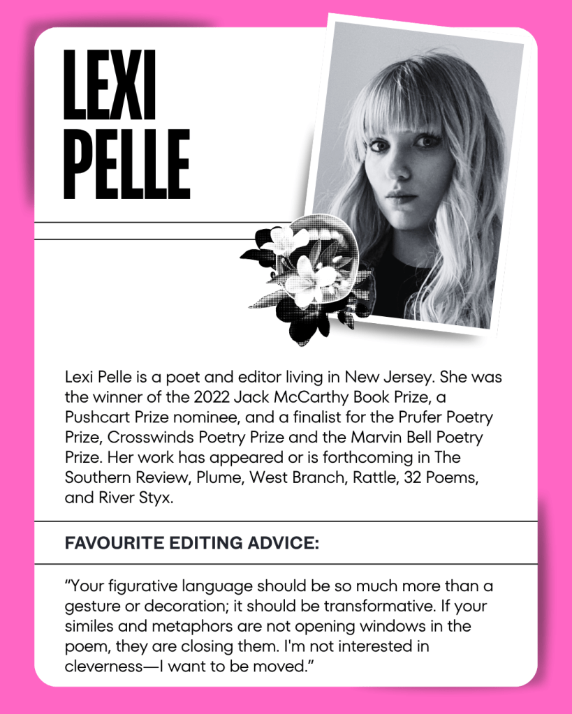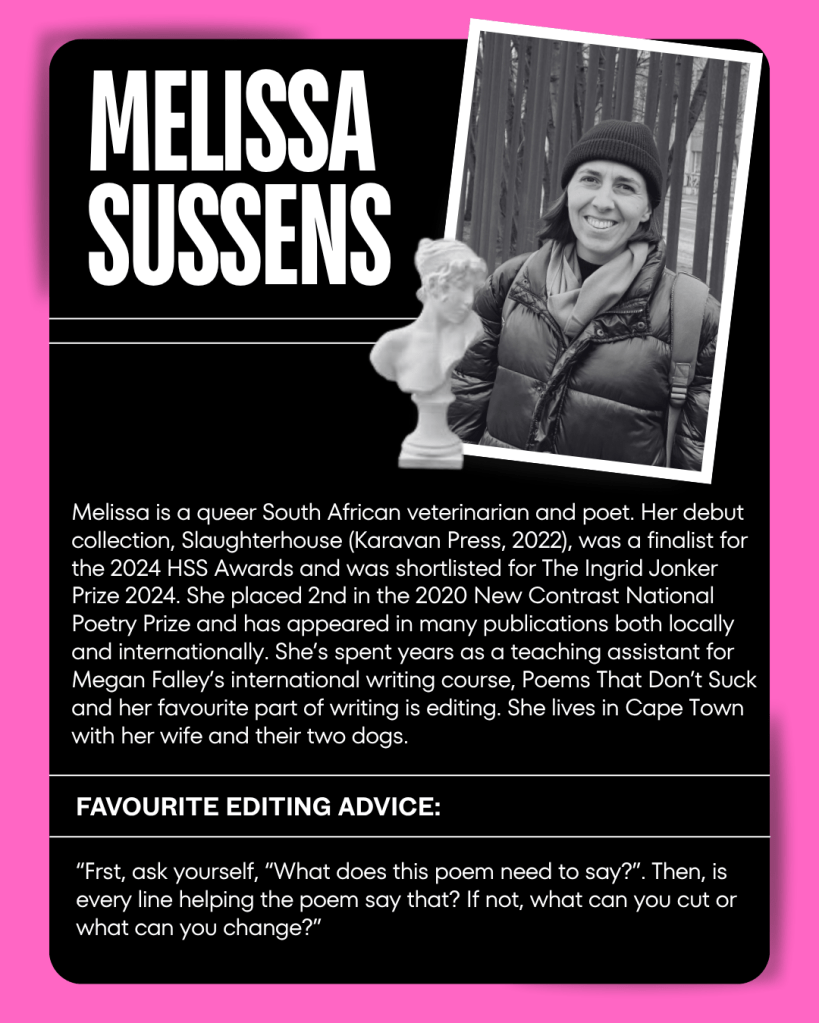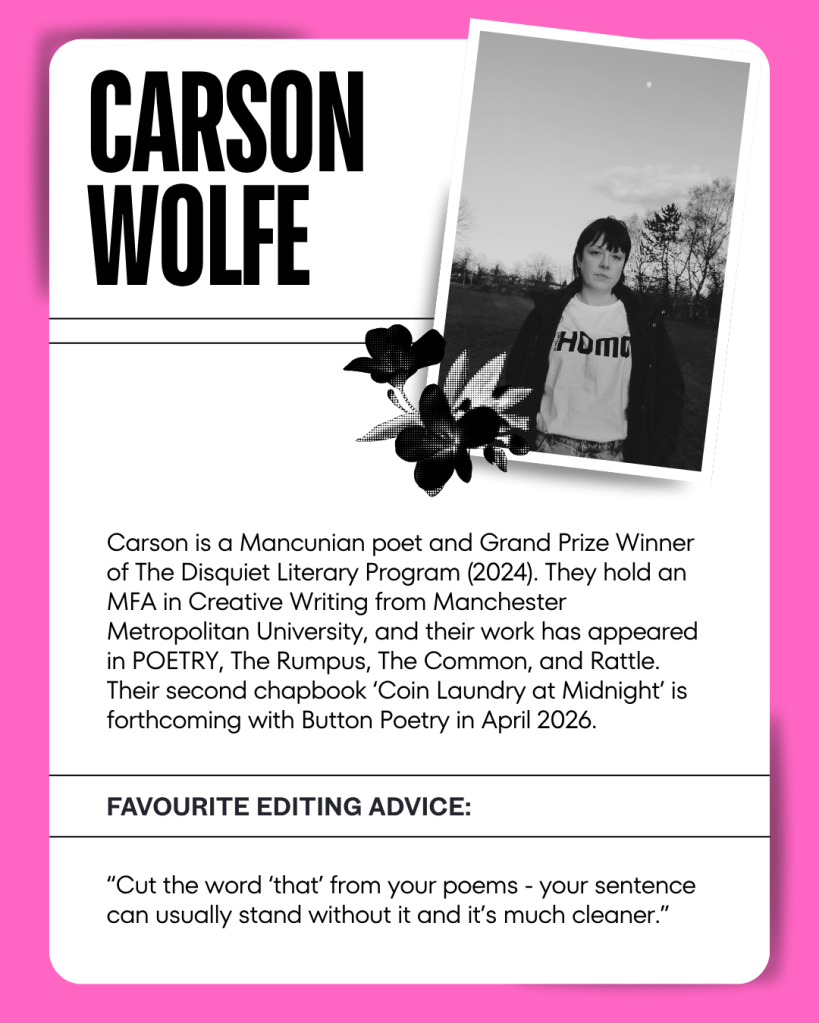 Using a fishbowl style of teaching, as inspired by the renowned online poetry course, Poems That Don’t Suck by Megan Falley. We pull four names at random from the attendee list and live-edit these ‘fishes’ before audience participants, followed by a short Q&A.