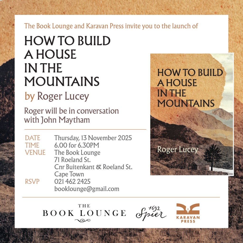 Please join us for an evening of storytelling and song when we launch How to Build a House in the Mountains by Roger Lucey at The Book Lounge, on Thursday, 13 November 2025, 6 for 6.30PM. Roger will be in conversation with John Maytham.