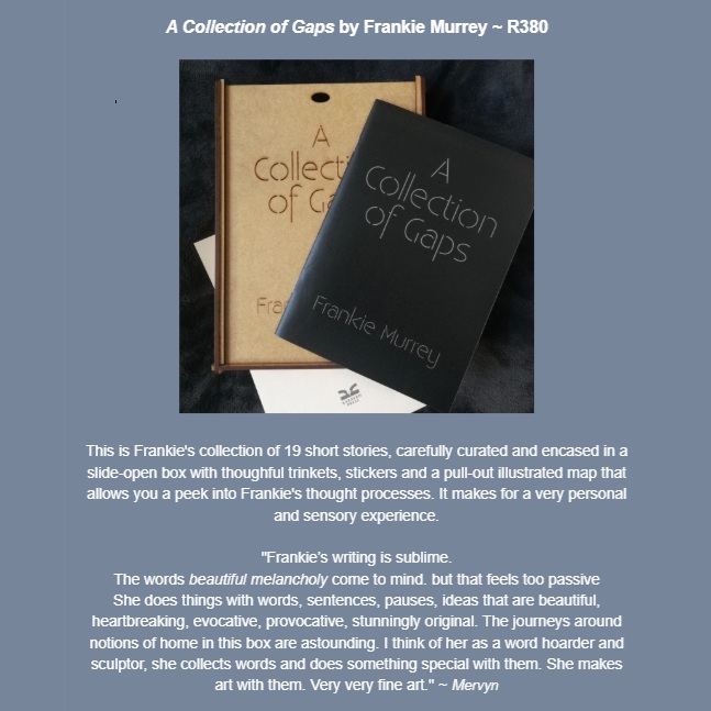 FRANKIE MURREY worked in the book retail sector for many years before becoming the coordinator of Open Book Festival, which takes place every year in early September in Cape Town. In 2015, her work was awarded the Chevalier de l’Ordre des Arts et des Lettres. She resigned from Open Book Festival at the end of 2019 and started her own company, FM Project Management. Through this company, she has since been curating or managing creative events and projects that align with her interests. She also returned to Open Book in 2022, a space she’d missed intensely. She won the HSS Award for Best Emerging Author in the Fiction Category for her authorial debut, Everyone Dies, in 2024. A Collection of Gaps is her second volume of stories and will be first published in a special, limited edition as a box containing stories and other treasures.
