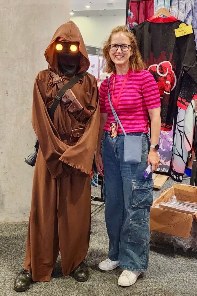 This year, I was invited to participate at Comic Con Cape Town as an exhibitor with the Romance Writers Organisation of South Africa (ROSA). As a member of ROSA, I assisted other members who were hosting the ROSA stand next to the main stage. Writers, readers, fans and publishers stopped to buy books or discuss reading and the craft of writing. I displayed my books, Shadow Flicker, A Fractured Land and The Pool Guy. I am so proud of the beautiful physical books that my publisher, Karavan Press, created for my stories. The Cape Town City Library stand was nearby, on the other side of Artist’s Alley, so I and the other ROSA writers enjoyed meeting them and discussing strategies to raise up readers and writers together through libraries and author events. The ROSA stand was coincidentally at the gathering point for the daily Cosplay competition. (Cosplay is costume play – a form of performance art where fans dress up as their favourite popular culture character.) We had a close-up view of Vikings, superheroes, a Fremen (from Dune) in a Stillsuit, and children’s cartoons characters. Captain America had to sit down to take a break after a lengthy round of selfies with fans. A writer came to the aid of one cosplayer who found the confines of a heavy costume caused overheating. Perhaps there’s inspiration for a fictional meet cute there?