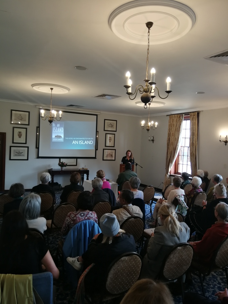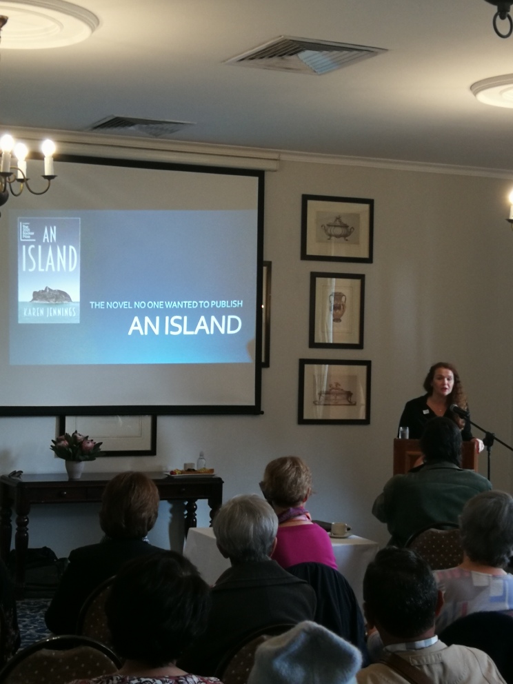 Earlier today, Karen Jennings addressed the Rondebosch Book Club about her novel, An Island. She called her talk “The novel no one wanted to publish”. She had a copy of the UK edition of the book with her. It was the first time I held it in my hands. Until it was published, I did not know that one of the quotes used for its cover would be taken from a review I wrote of Space Inhabited by Echoes, Karen’s debut poetry collection, for the Cape Times. I am so happy that these words are featured on the back of the novel. I have loved Karen’s work for a very long time. It is such an honour to be able to publish it in South Africa.