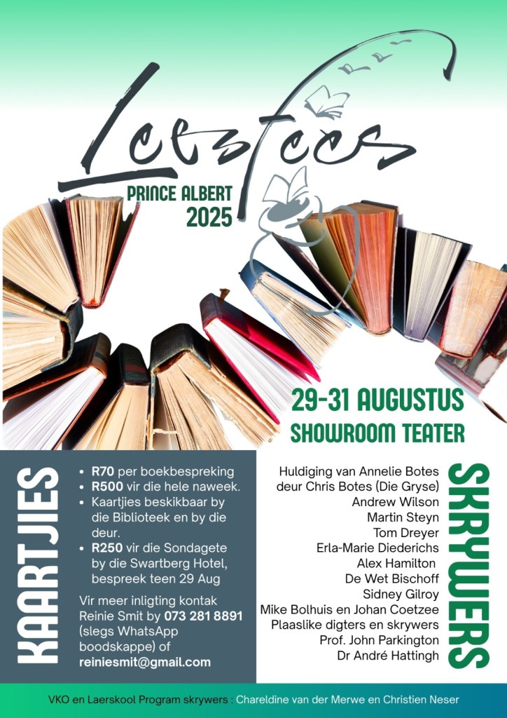 Thank you to Hannes Visser and all the hardworking volunteers who put this inspiring festival together! One day back home and I am already looking forward to the next Leesfees, and I sincerely hope that I will be visiting Prince Albert again even sooner. So many places still to explore and the Karoo … The space, the light, the incredible, harsh beauty of it all … I can never get enough of it!