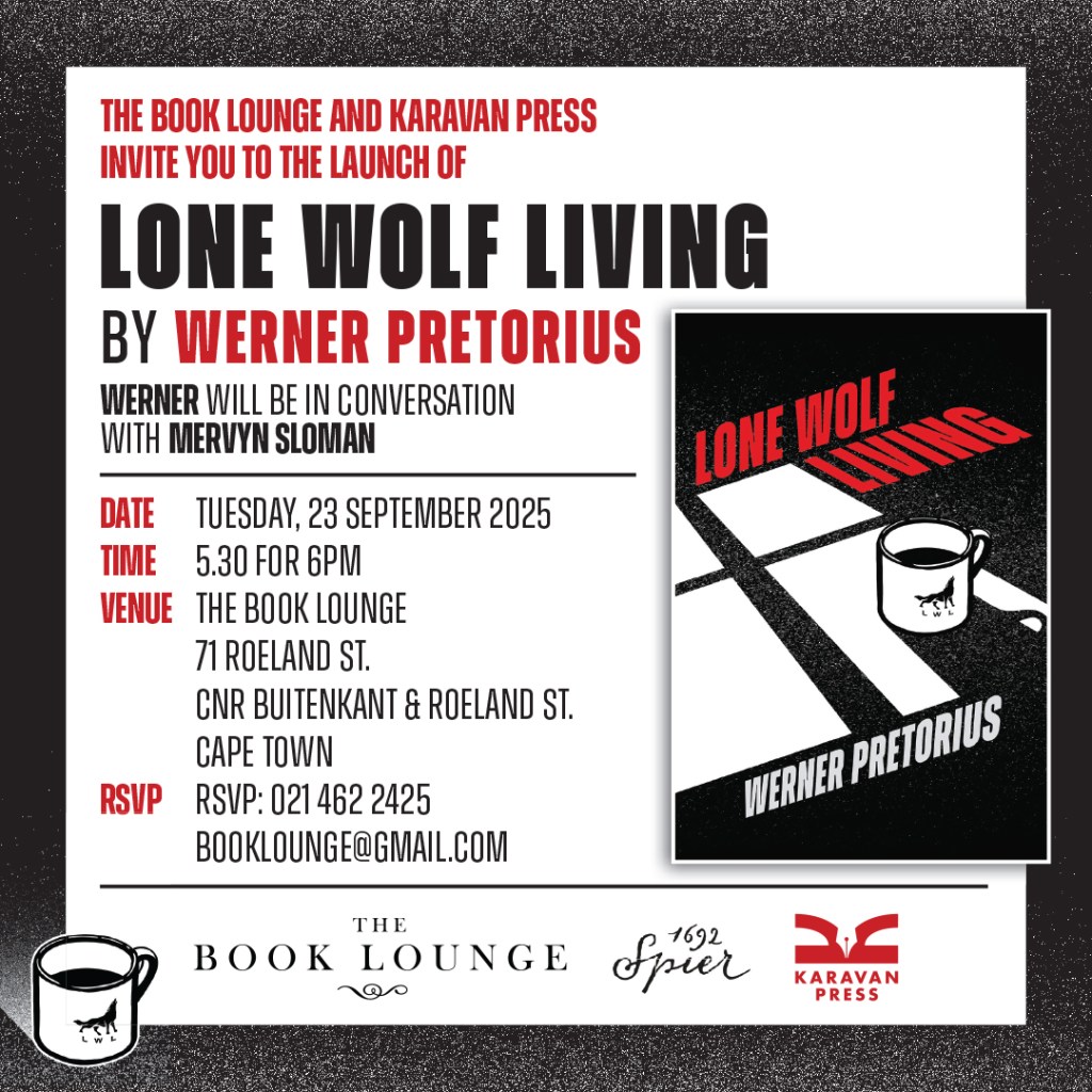Tuesday, 23 September 2025: Please join us for the launch of Lone Wolf Living by the The Book Lounge’s very own Werner Pretorius. Werner will be in conversation with Mervyn Sloman. And in the beginning, I will share a story about how this stunning collection of stories came into being … Can’t wait!