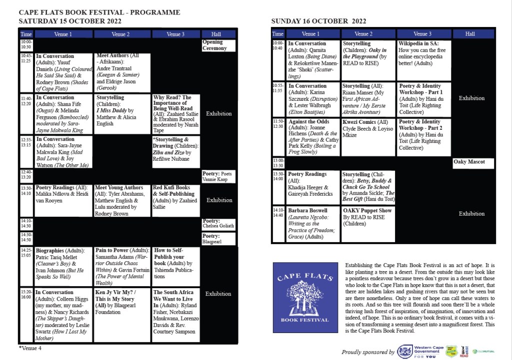 The Cape Flats Book Festival will be taking place on 4 and 5 November this year, and I cannot encourage you enough to attend this wonderful festival. Last year was the first time Karavan Press participated and we had an amazing time. We are so happy to have been invited back and can’t wait!