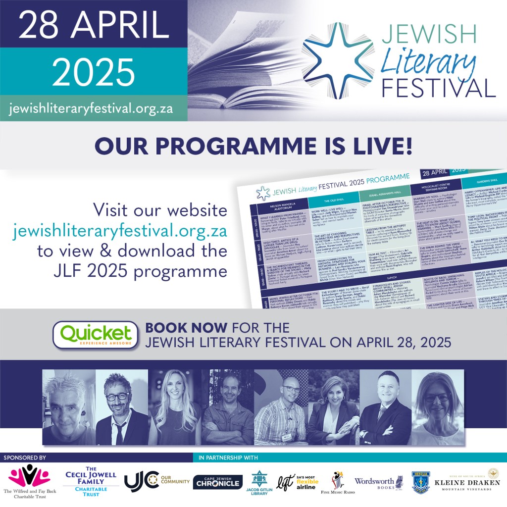 This is the third edition of the bi-annual Jewish Literary Festival, a one-day event for lovers of literature and Jewish life. Between 10 a.m. and 5 p.m. on Sunday, 15 March 2020, readers can engage with more than 70 wordsmiths, poets, journalists, filmmakers and educators over more than 40 sessions. The presenters all have some Jewish connection, are engaged with subjects of Jewish interest or have a way with words and, with multiple sessions running simultaneously throughout the day, the organisers offer genres that cover fiction, sport, food, memoir, politics, journalism, the arts and more – a wide choice to suit all tastes. It is a literary feast of note. Don’t miss it! Tickets sell out quickly, so do not hesitate to book yours here: Quicket.