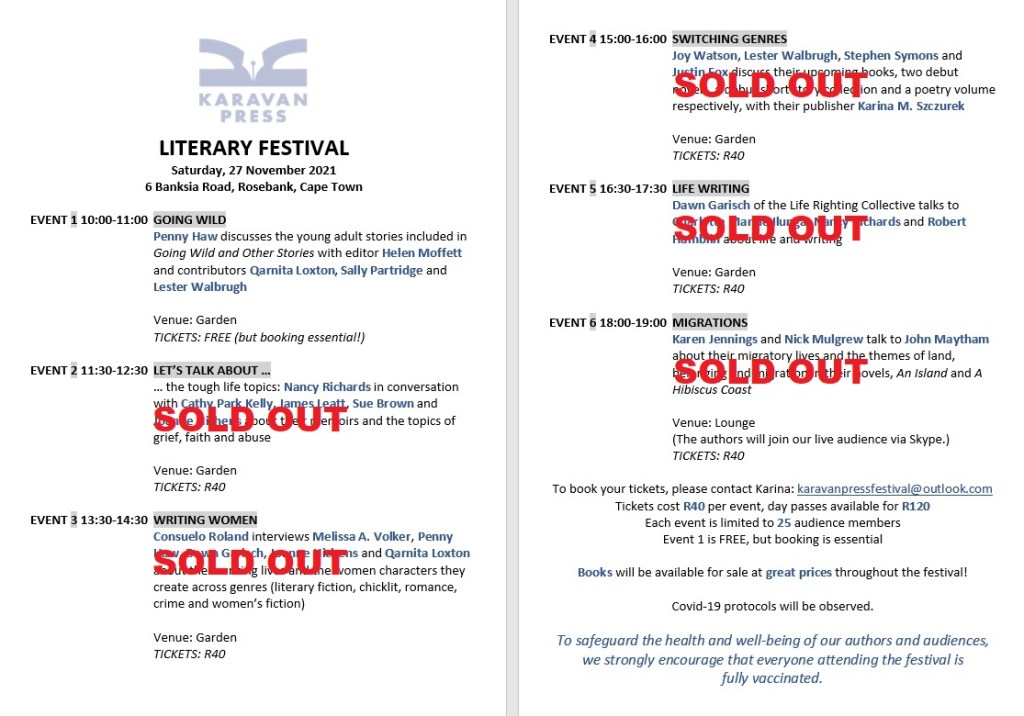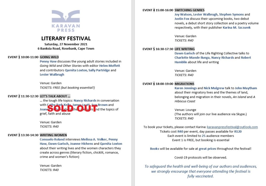 Please join us for the Karavan Press Literary Festival on Saturday, 27 November 2021, in the garden and lounge of Karavan Press's headquarters at 6 Banksia Road, Rosebank, Cape Town.