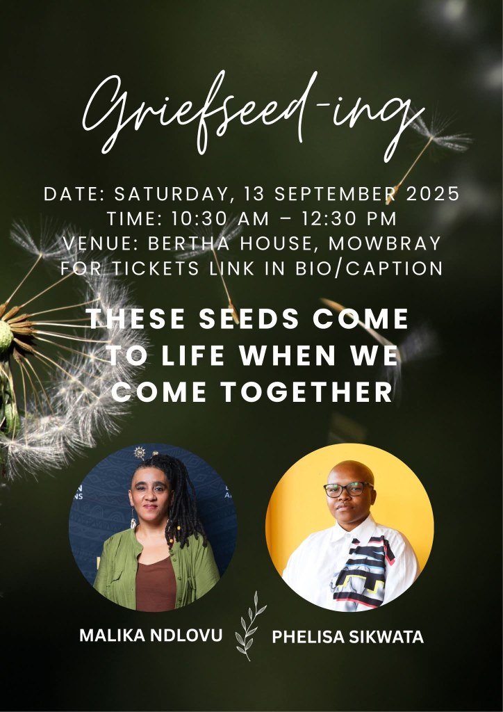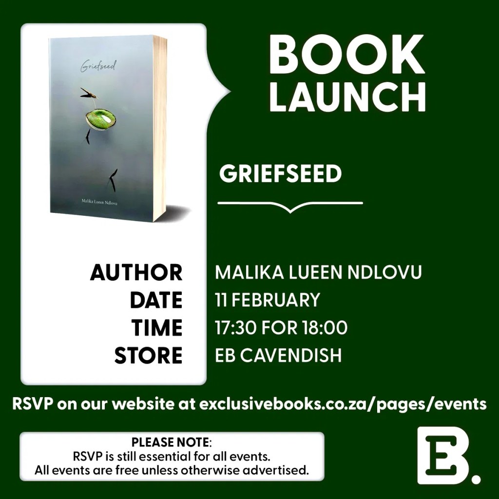 Please join us for the launch of Malika Lueen Ndlovu‘s Griefseed on Tuesday, 11 February 2025, at Exclusive Books Cavendish. Malika will be in conversation with Barbara Boswell.