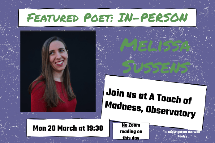 Melissa Sussens will be reading at The Red Wheelbarrow Poetry Collective on Thursday, 9 November: